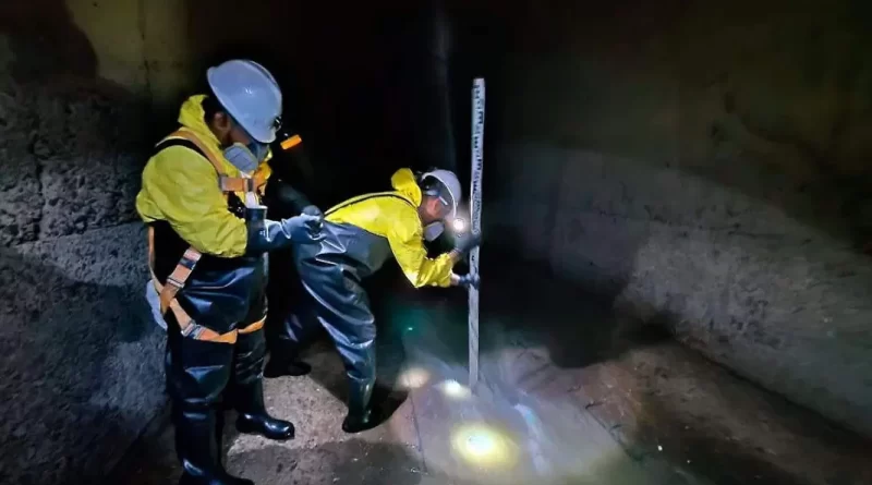 El personal del municipio bajó a más de ocho metros de profundidad y colocó costales de arena para crear una represa al interior de la bóveda, con el fin de desviar el afluente y empezar con los trabajos de medición y reparación.